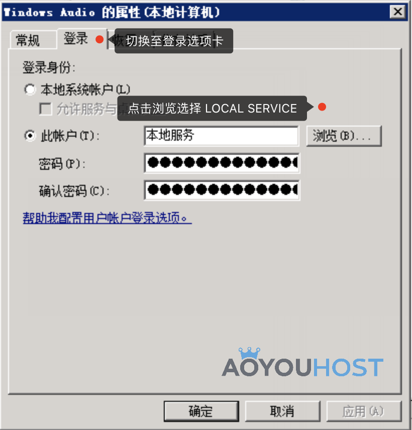 切换到登录选项卡,点击:浏览->高级->立即查找->选择 LOCAL SERVICE: