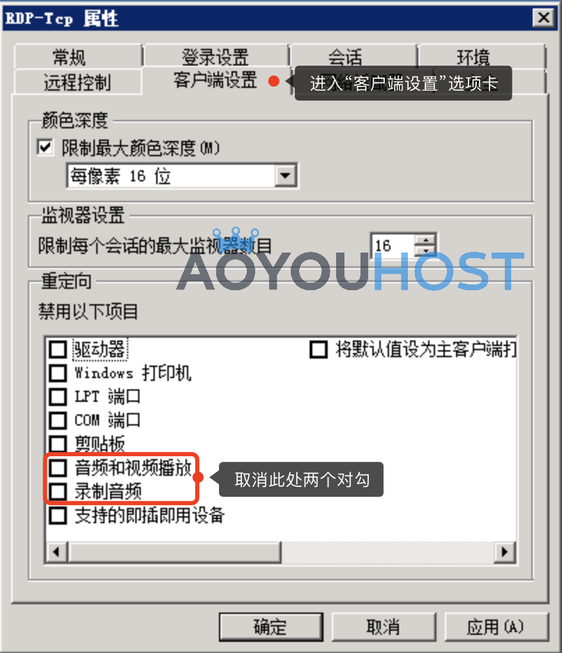 双击 RDP-Tcp,切换到客户端设置选项卡: