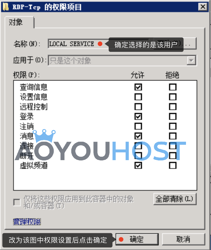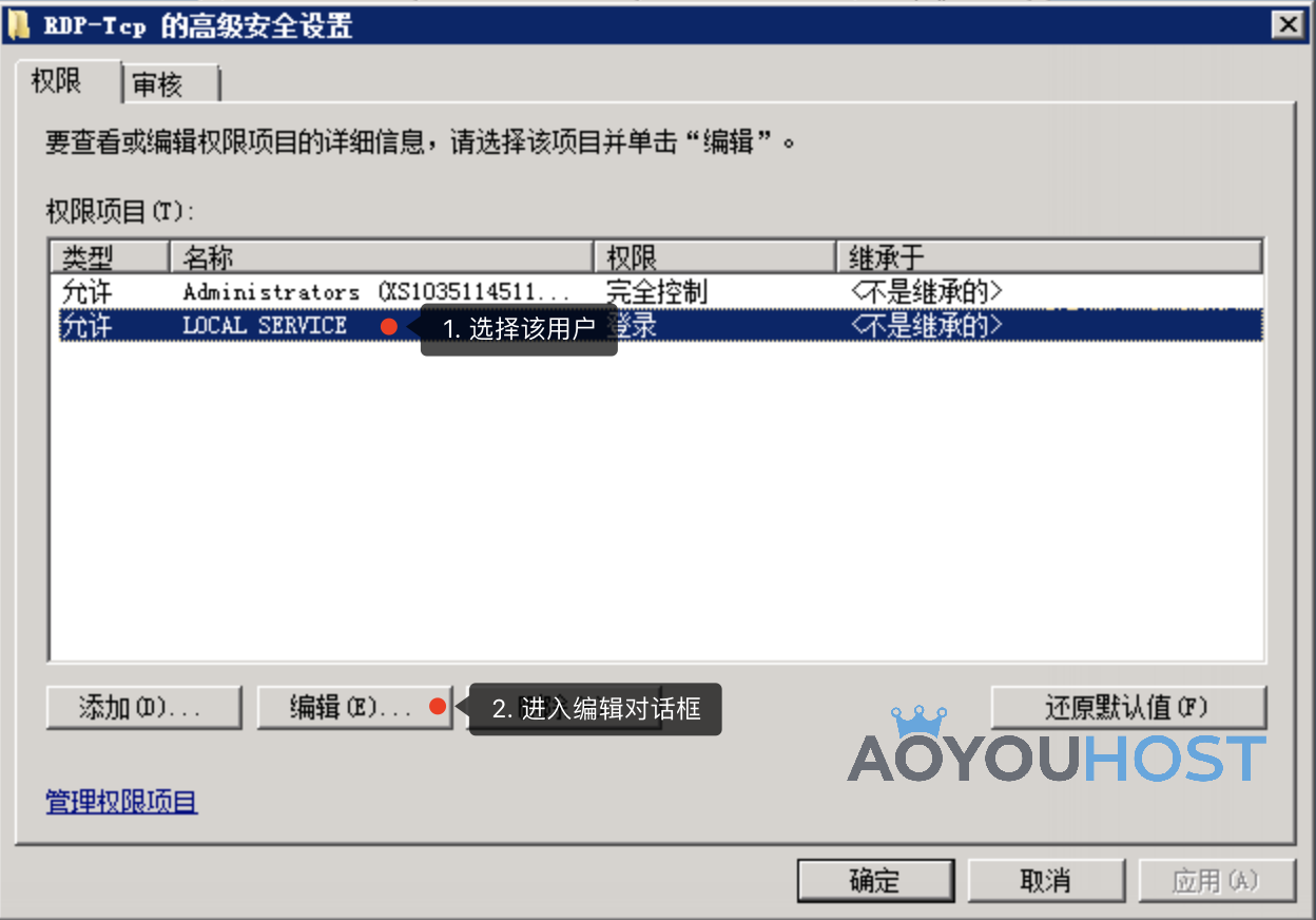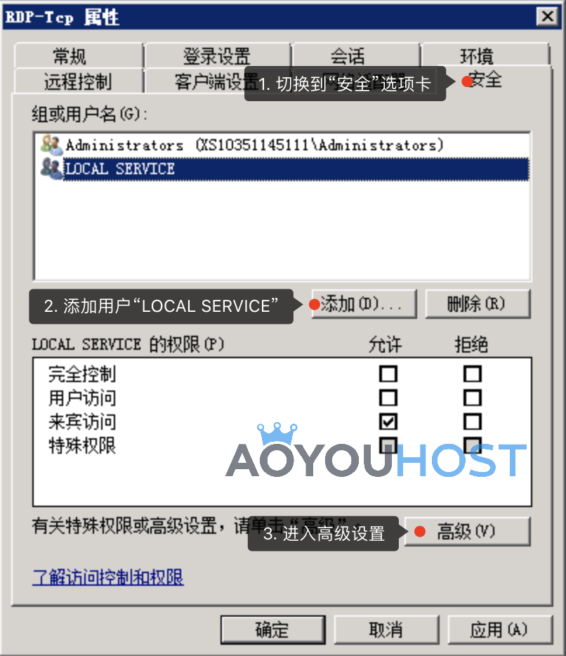 切换到安全选项卡,同上添加用户:LOCAL SERVICE: